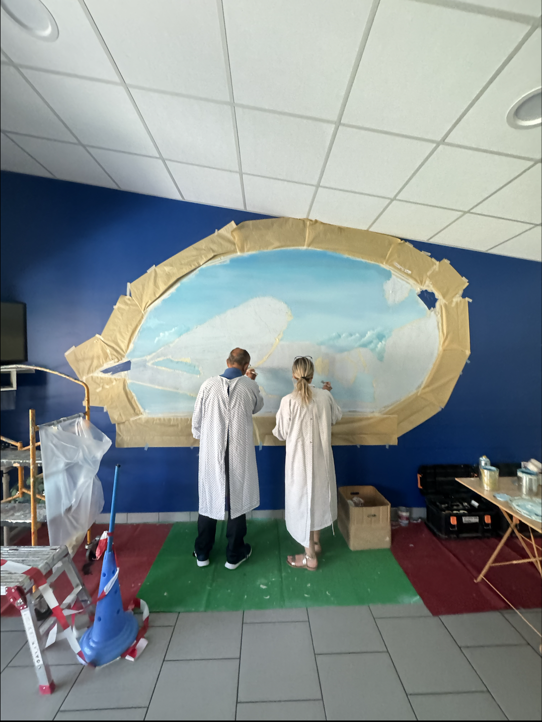 ésidents peignant les premiers aplats de ciel sur la fresque, accompagnés sur le mur bleu de la MAS.