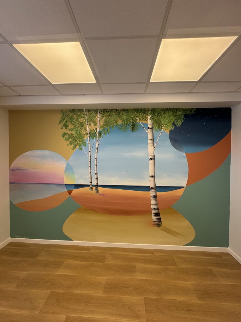En 2025, nous avons réalisé une fresque murale dans les futurs locaux du C.U.M.P d’Albi (Cellule d’Urgence Médico-Psychologique), un service hospitalier qui accompagne les enfants et adolescents ayant vécu un traumatisme. Pensée comme une parenthèse de sérénité, elle invite à la respiration et à l’apaisement.