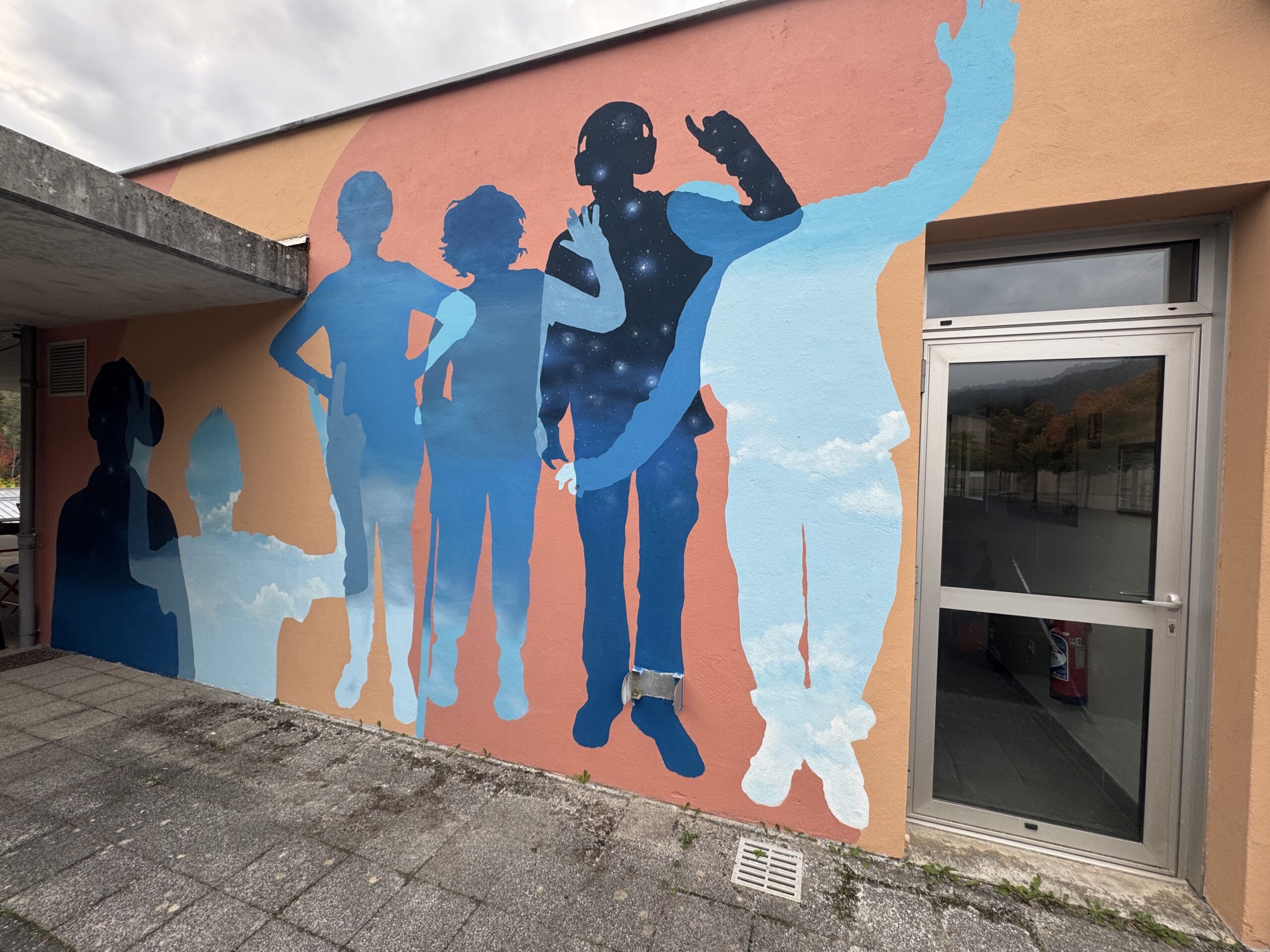 Sur le mur opposé, nous avons dessiné et peint les silhouettes des résidents, capturées à partir de photos réalisées en amont. Ces corps en mouvement sont eux aussi traversés par des ciels changeants, comme si chaque personne portait son propre univers intérieur et son propre horizon.