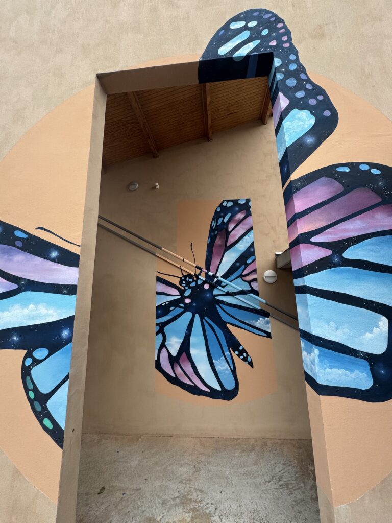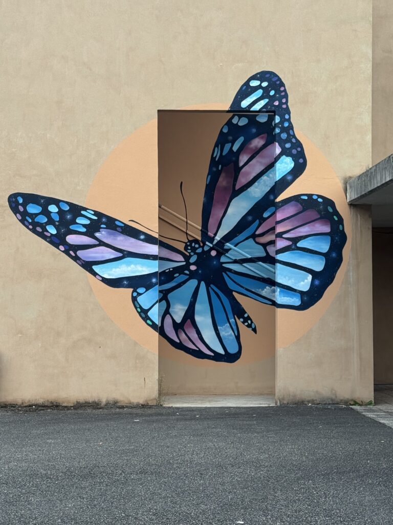 Peinte sur et autour d’un passage extérieur, l’œuvre se dévoile pleinement uniquement depuis un point de vue précis. Ses ailes mélangent ciels de jour et ciels de nuit : nuages doux et réalistes, nuances galactiques profondes…