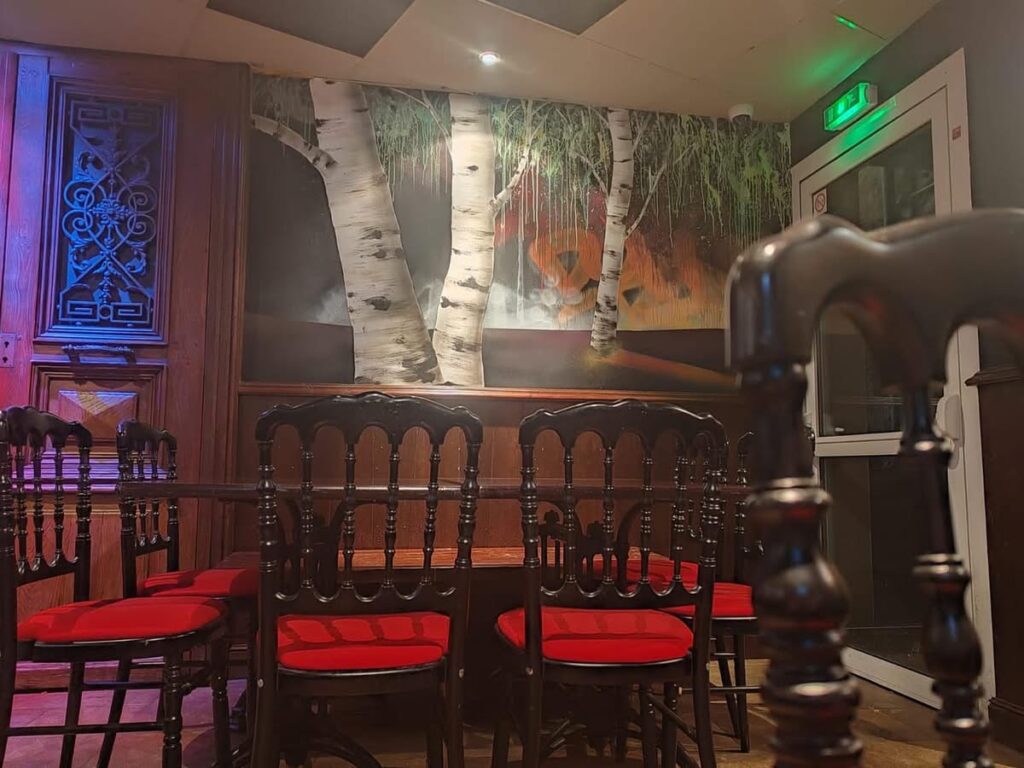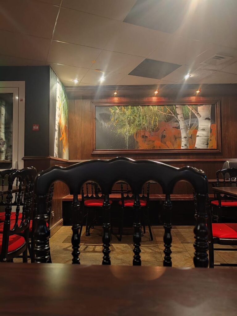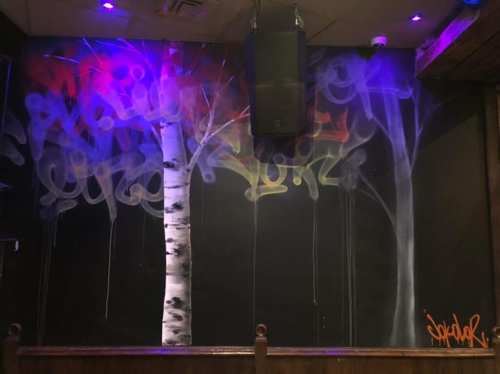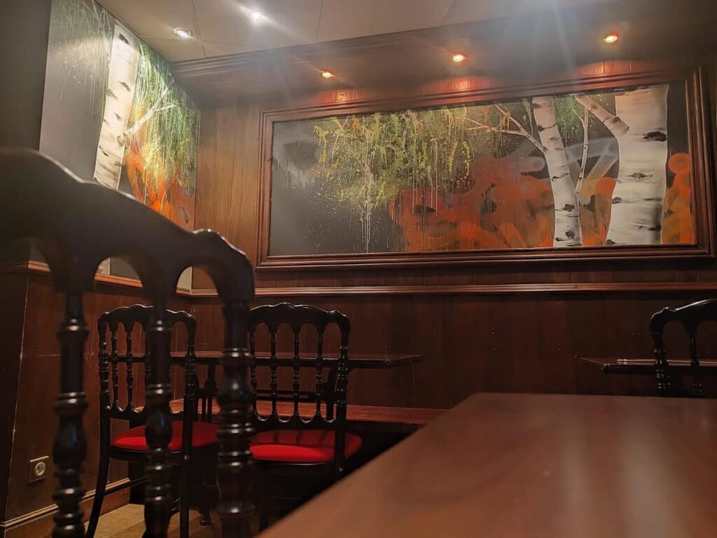 En 2024, j’ai pu intervenir au Bar de Nuit / Restaurant Le Bruit Qui Court, en plein cœur de Rodez. J’y ai réalisé une série de bouleaux en noir et blanc, une œuvre qui s’anime au rythme des soirées ruthénoises.