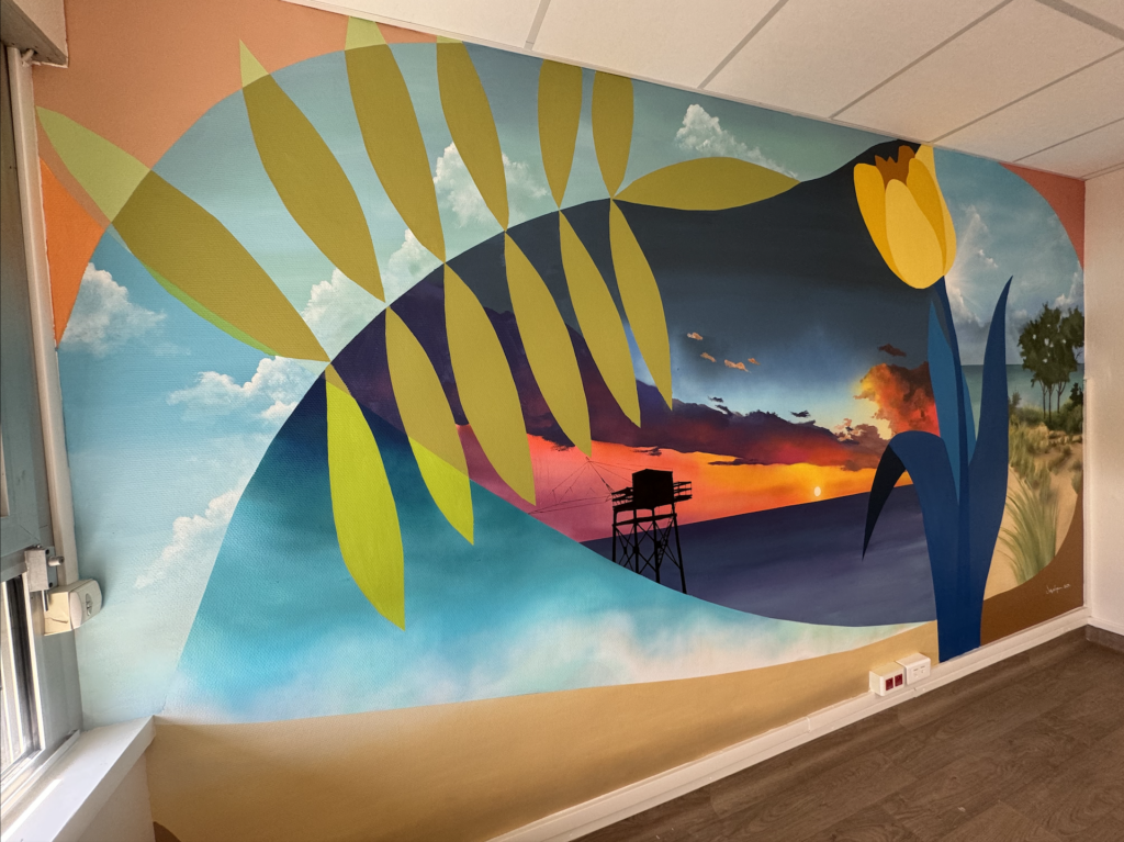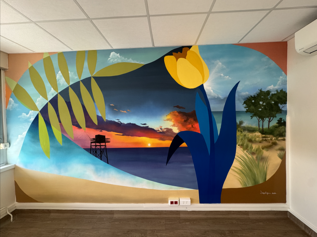 Au Centre Hospitalier Royan Atlantique, j’ai réalisé une fresque murale pour accompagner l’ouverture du nouveau service d’oncologie, prévue pour l’été 2025.